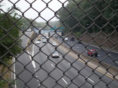 Through the fence, looking North, you can see the Major Deegan Expressway (I-87). I think the fence is there to keep the cars from getting out. Some mornings it looks like just a lot of vehicles that aren’t going anywhere. Make up your own clever simile.