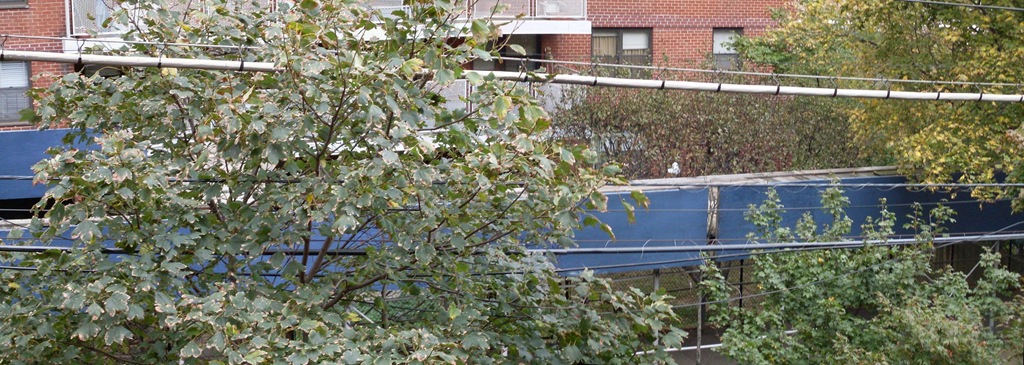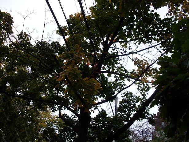 Everywhere around New York there are trees growing into, through, over, and around power lines. The Parks Department routinely plants trees, for some inexplicable reason, directly under every aerial power line in the city. However, small trees, like kittens, grow up to be cats. That isn’t quite right. Just as kittens grow up to be cats, small trees grow up to be tall trees with big branches that eventually break off and destroy power lines.