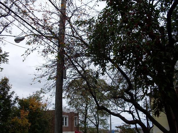 These ones are in front of my neighbor’s house. It is hard to tell where the power lines end and the tree begins. The tree branches are the ones with leaves on them.