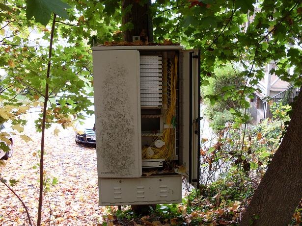 An enclosure without a cover is called an opening. It is no wonder we lose phone and cable service every time it rains. This city has the electrical infrastructure characteristic of many third world countries. The trees are owned by the city and the lines are owned by the utility companies, and neither one will take responsibility for the maintenance of the other.