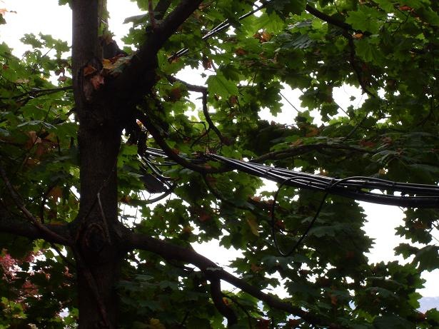 The insulation on this cable has already been pulled apart under the strain of the branches weighing it down.
