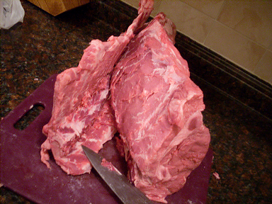 Doing so requires a long sharp knife. Unfortunately, I do not have a proper boning knife, but I keep my knives razor sharp so that I can perform emergency surgery with them.