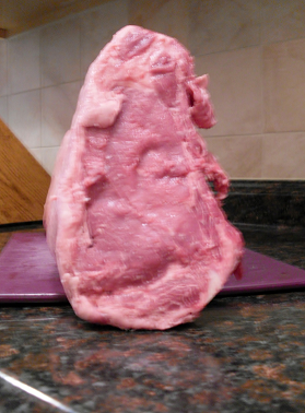 Here is the meat with the plastic wrap removed. Usually, I spill the runny juice on the floor, but that step is optional.