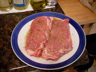 After grinding sea salt and fresh pepper on both sides, I coat them with a bit of Italian dressing as a marinade.
