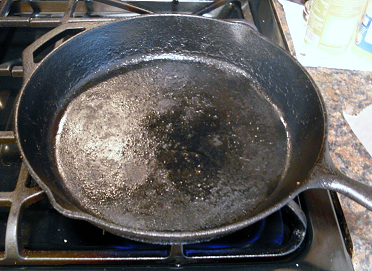 I heat a cast iron pan until it looks like it will burst into flames. There is no oil in the pan, and it is just starting to smoke.
